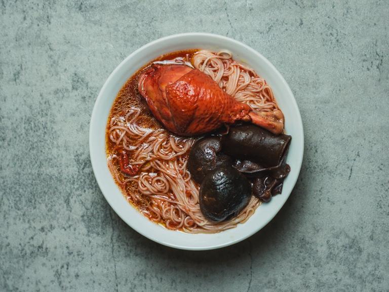 Moyang Michelle pernah memberitahunya bahawa kebolehan seseorang memakan ayam wain merah adalah seakan ujian kalau orang itu benar-benar berdarah Foochow. Rasanya unik—lagi kuat rasa wain merah, lagi sedap. Wain beras yis merah merupakan bahan yang dibuat di rumah, oleh itu perisanya akan mempengaruhi kuah mi sup ini. Wain buatan nenek Michelle sering berasa masam, dan wain buatan adik neneknya berasa manis, walaupun mereka berdua menggunakan ramuan dan proses yang sama. Perasakan menggunakan kicap cair dan wain halia mengikut citarasa anda.